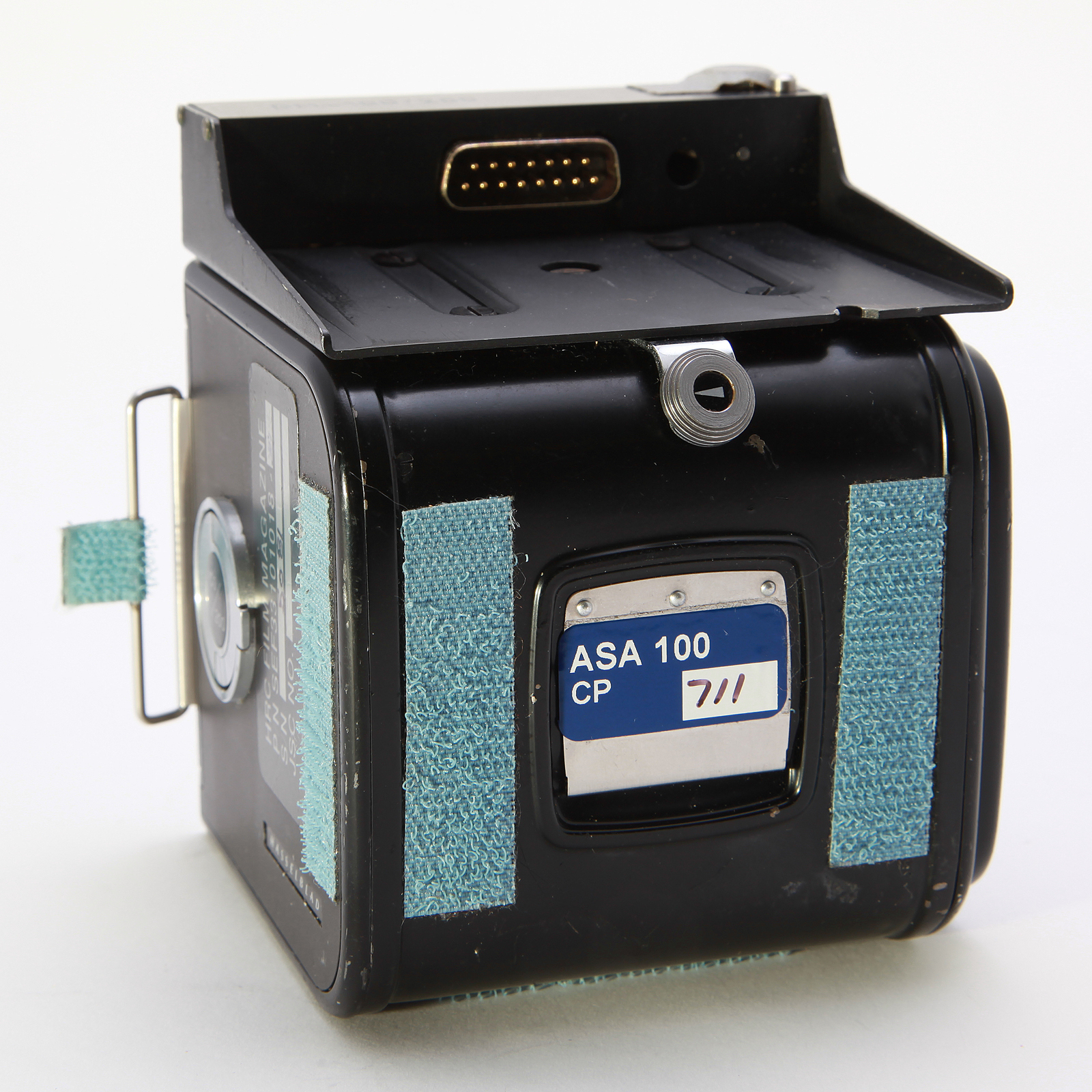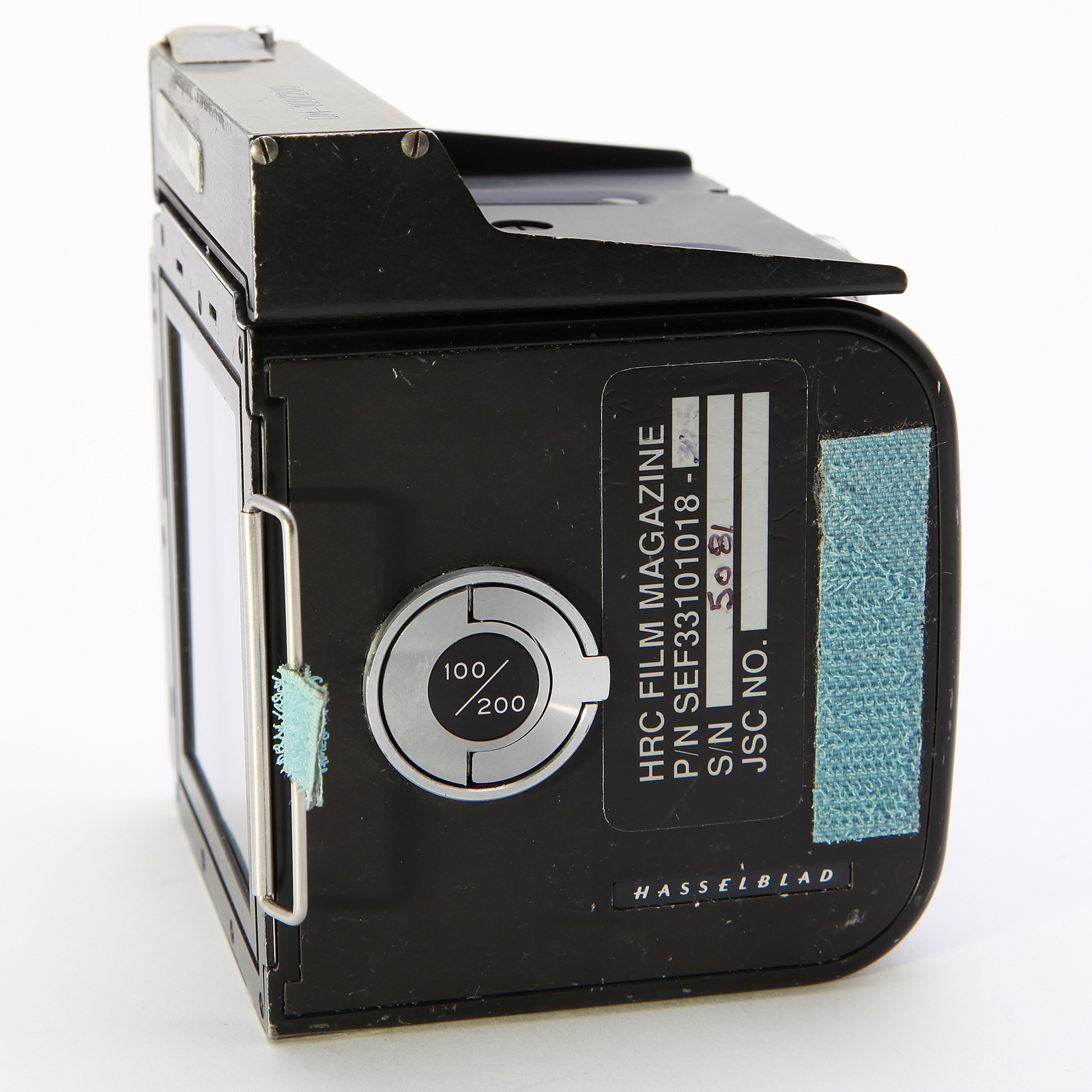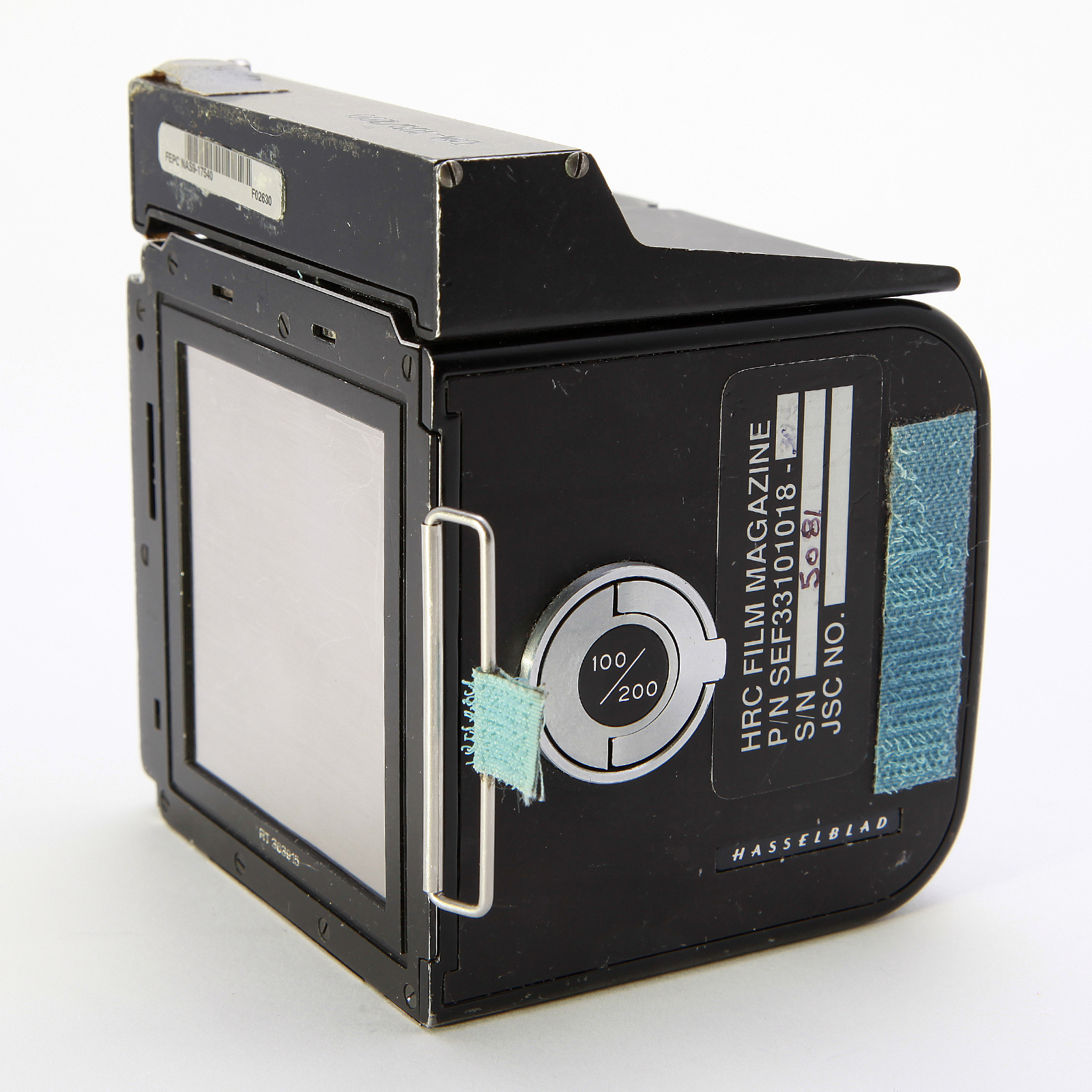 This Film Magazine was manufactured by Hasselblad of Gothenburg Sweden in 1986. Normally seated on the top of the magazine was a Hasselblad Data Module. The Data Module Assembly printed 32 alphanumeric characters along the edge of each 70mm film frame at the time of exposure, indicating the date, time, film roll number, frame number, and Space Shuttle mission number. The film spool, also flown, is included inside the magazine.