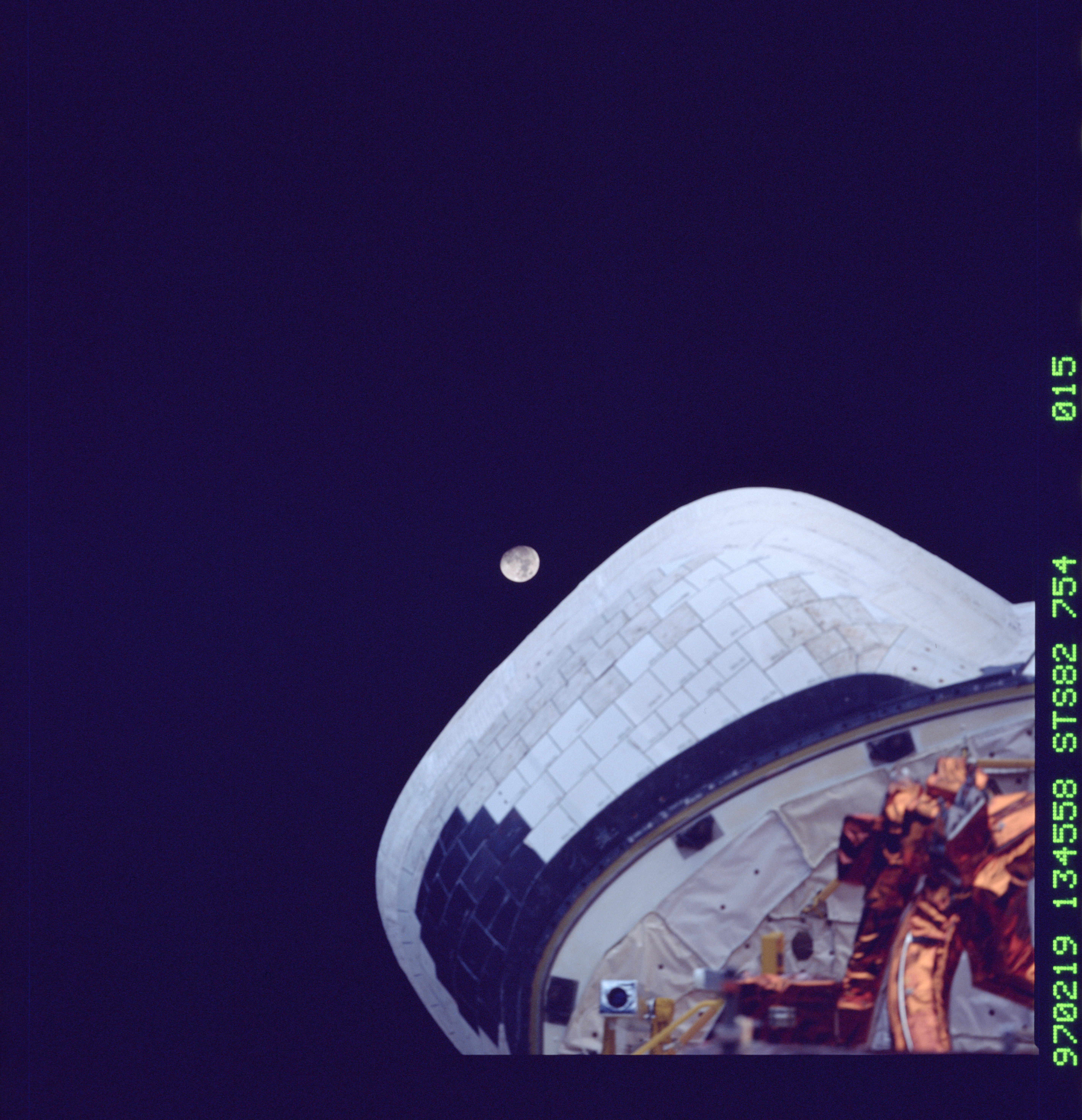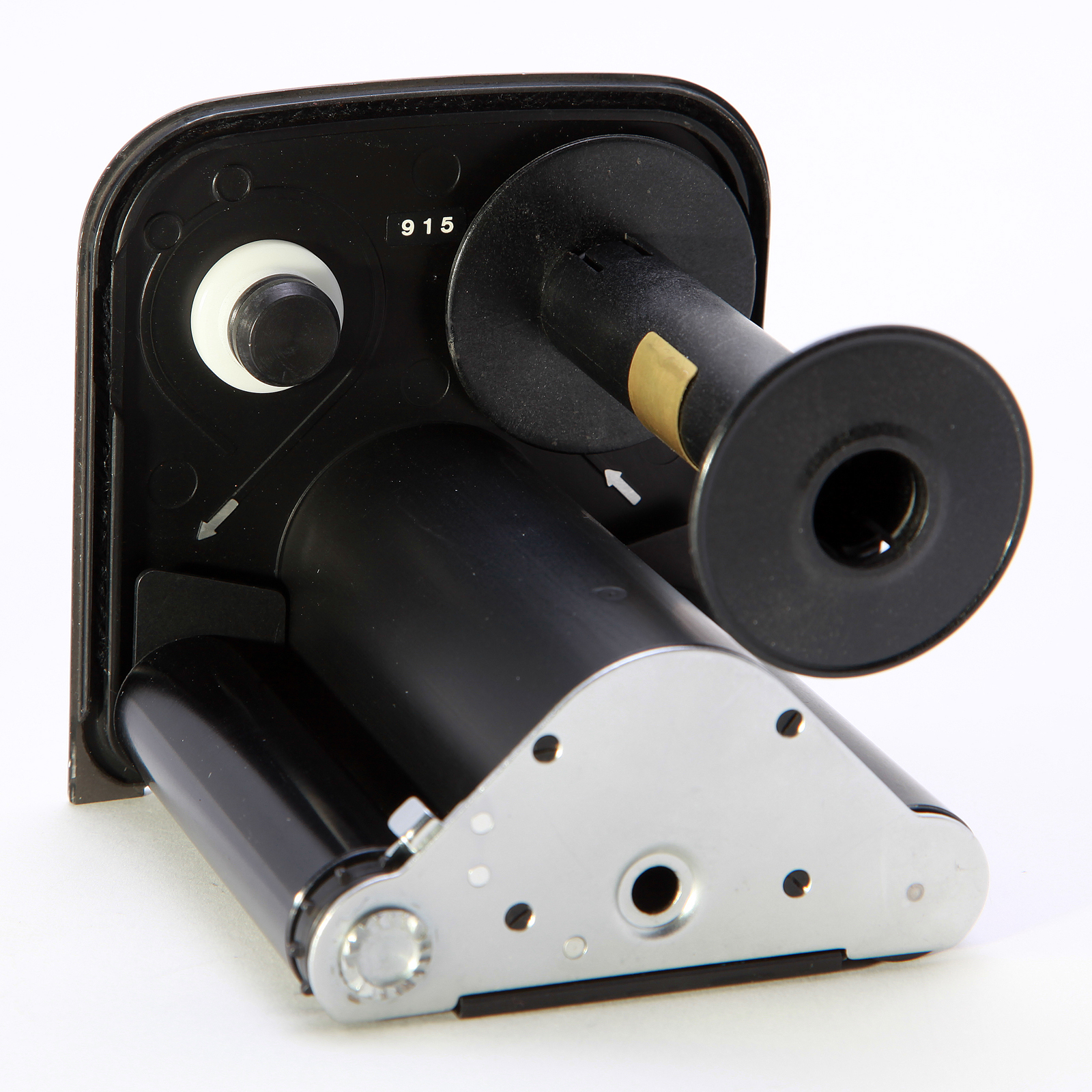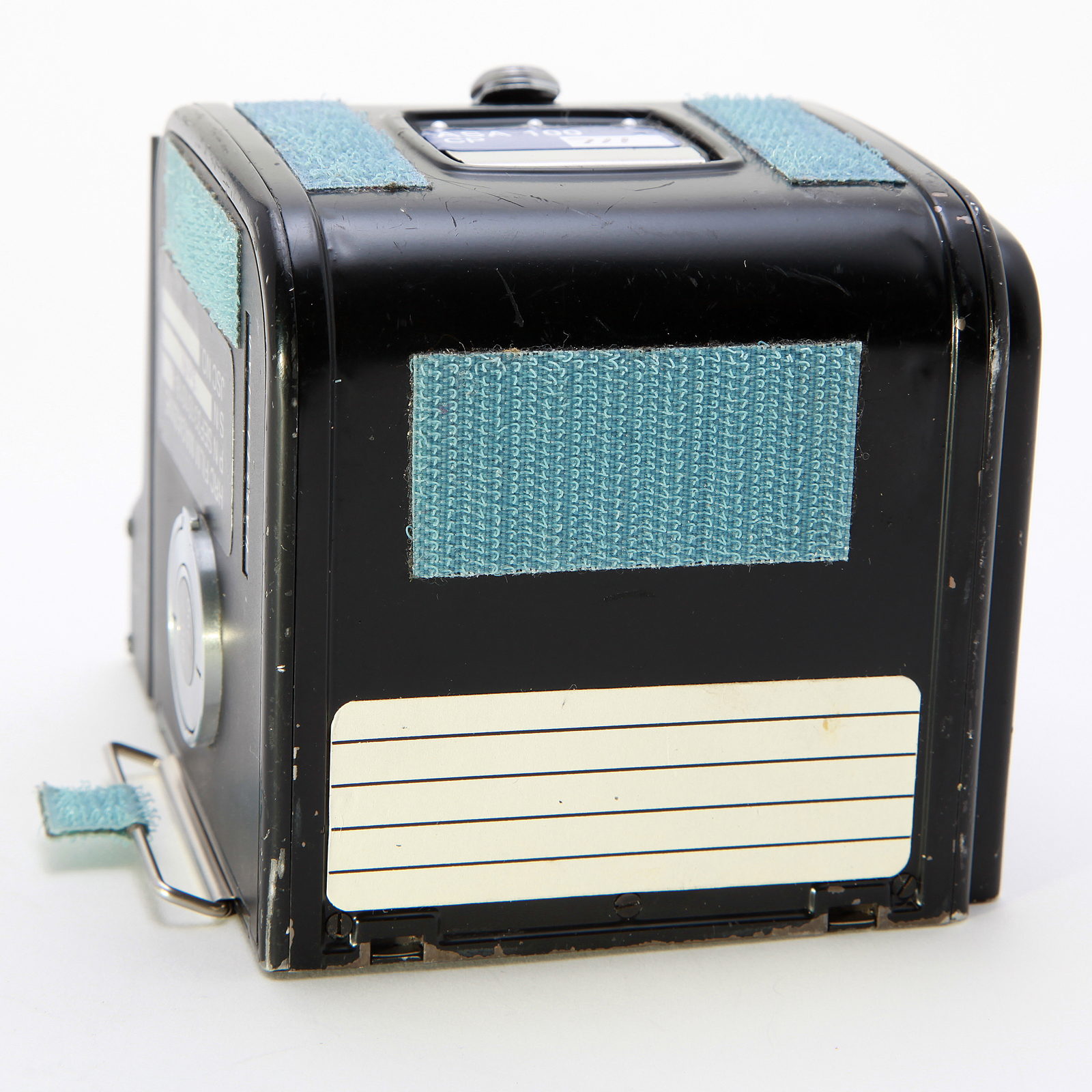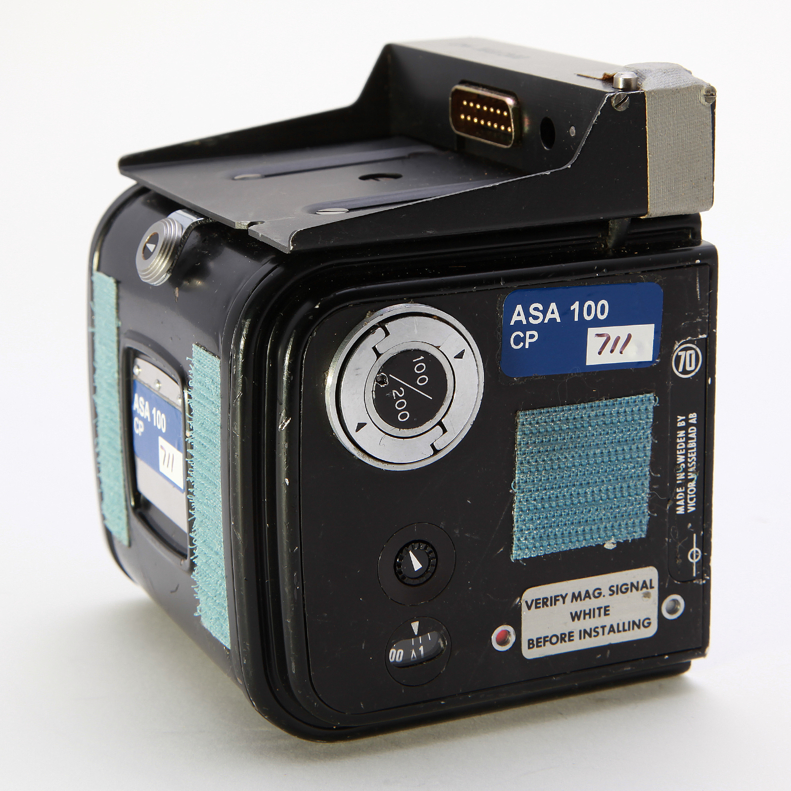 This Film Magazine was manufactured by Hasselblad of Gothenburg Sweden in 1986. Normally seated on the top of the magazine was a Hasselblad Data Module. The Data Module Assembly printed 32 alphanumeric characters along the edge of each 70mm film frame at the time of exposure, indicating the date, time, film roll number, frame number, and Space Shuttle mission number. The film spool, also flown, is included inside the magazine.
