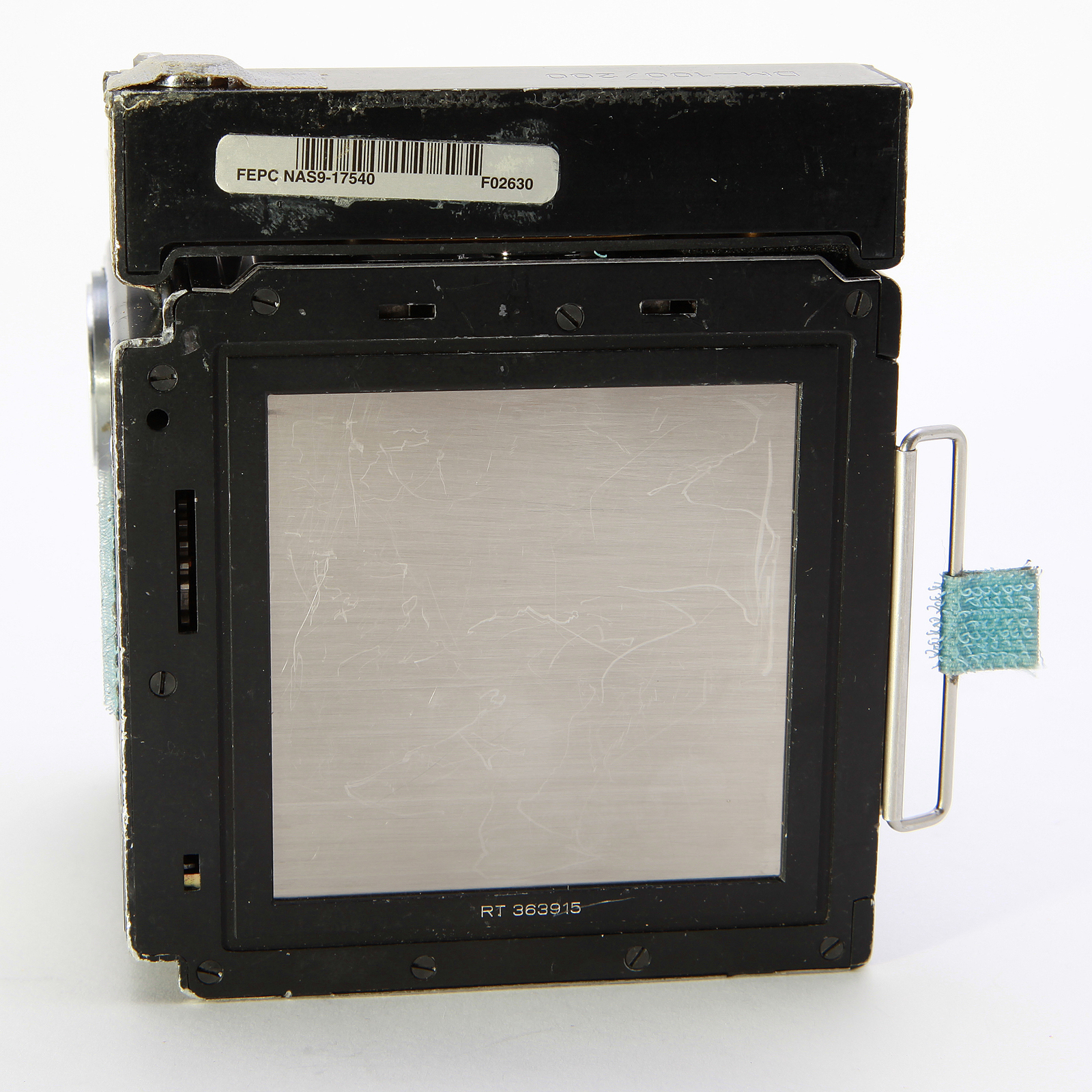 This Hasselblad 70mm Film Magazine bears NASA serial number 5081, and Hasselblad serial number RT 363915. It was flown on Space Shuttle Discovery, Columbia, Endeavour, and Atlantis. The missions listed below are among it's flights. There most definitely have been others prior to STS-76 that are not documented. The Film Magazine is as it was flown on it's final mission.