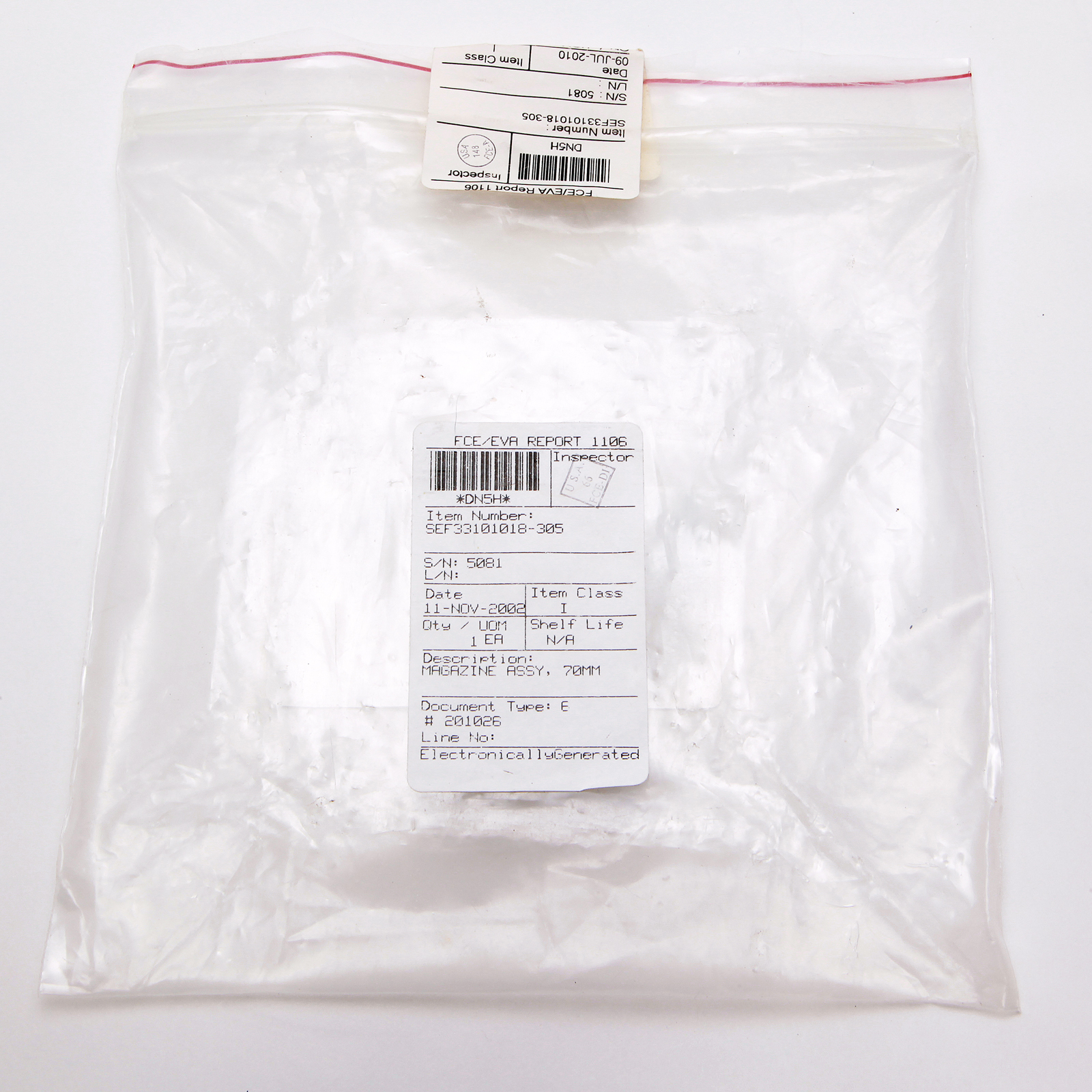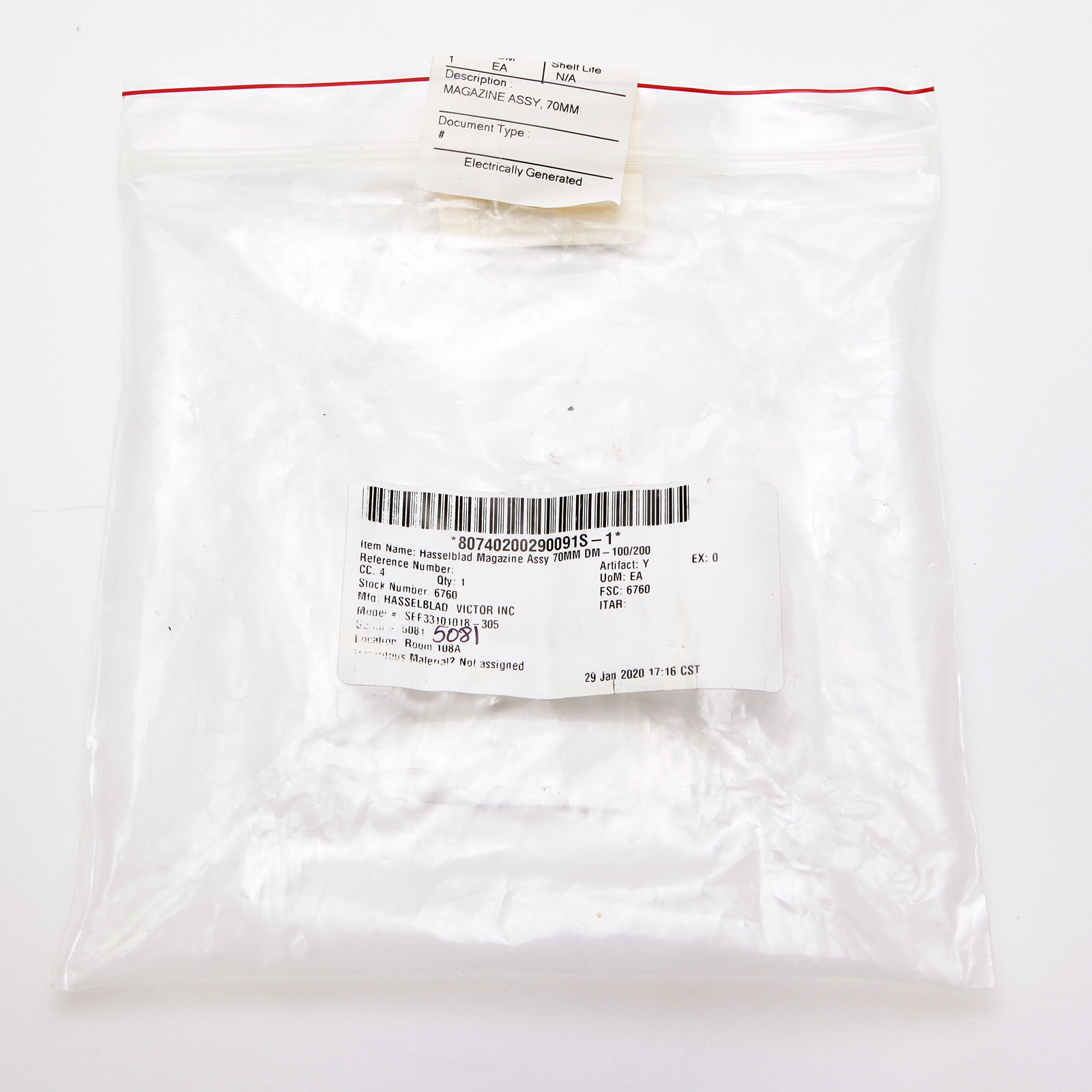 The original NASA parts bag along with disposal and inventory labels are included, and bear the part and serial numbers consistent with this 70mm Film Magazine.